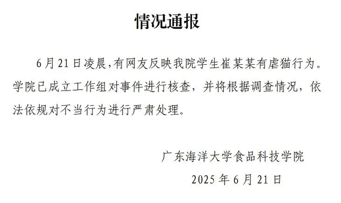 广东海洋大学通报“学生虐猫事件”