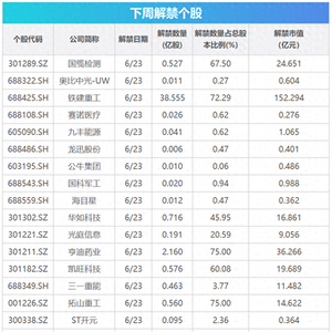 从解禁市值来看,6月23日是解禁高峰期。按6月20日收盘价计算,解禁市值居前三位的是:铁建重工(152.29亿元)、龙芯中科(146.55亿元)、亨迪药业(36.27亿元)。从个股的解禁量看,解禁股数居前三位的是:铁建重工(38.56亿股)、亨迪药业(2.16亿股)、宝钢包装(1.43亿股)。