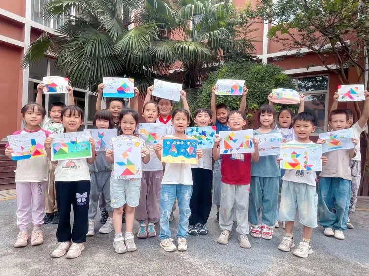 七巧板作为传统益智玩具,在一年级特色作业中发挥了重要作用。孩子们将七巧板拼成各种有趣的图案,如帆船、赛跑中的乌龟和兔子等。他们用不同颜色的三角形、正方形等形状拼接出独特的图案,这不仅培养了他们的动手能力,还提升了空间想象力。每一块几何图形都经过精心挑选和排列,形成了一个充满童趣的艺术作品。这些作品不仅展示了他们的创造力,还帮助他们理解几何图形的基本概念。