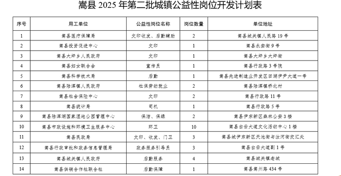 嵩县2025年第二批城镇公益性岗位招聘公告