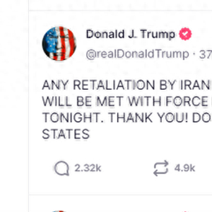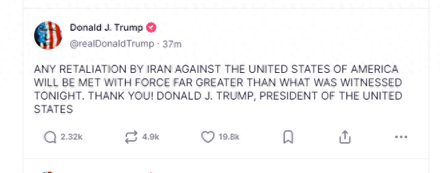 而在他讲话结束后不久,他又发帖警告称,“伊朗对美国的任何报复,都将遭到远超今晚所见的强硬回击。”