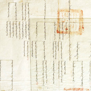 第二幅家谱同样在左上方开头用蒙古文书写,其拉丁文转写是“ǰarud-un baraγun γarun ǰasaγ törö-yin darqan beyile dobočai-yin qošiγun-u gerün üy-e-yin bičimel”,即扎鲁特右翼旗扎萨克多罗达尔汉贝勒多布柴旗家谱,末端署日期“光绪三十一年十月十五日”。