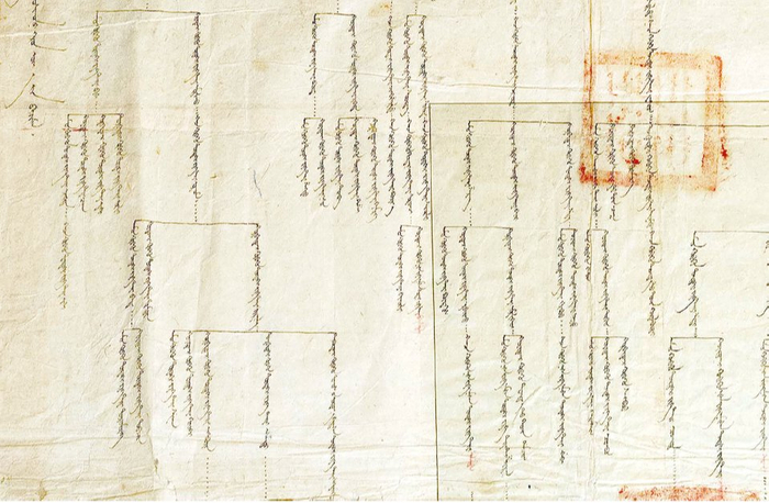 从目前所了解的情况来看,流传至今并能查阅的清代以来的内扎萨克蒙旗家谱,存世有210幅左右或更多。日本蒙古史学者森川哲雄教授认为:“现在所传家谱几乎都是19世纪末以后的,并不是旧谱。另外,该家谱最先记载的人物也是达延汗的子辈,好像没有记载之前的系谱者。”这是相当精确的概括。现存蒙旗家谱,或是某一旗扎萨克家族的,或是旗内某一支台吉家族的,极少数则是平民家族的。《中国蒙古文古籍总目》所收193幅家谱中有135幅为伊克昭盟各旗家谱,几近全数的四分之三,剩余四分之一为其他蒙旗家谱。在经历天灾人祸之后,清代蒙旗家谱流传至今的已经为数不多。仅仅伊克昭一盟各旗能够流传下来百余份家谱这一事实有力地证明,其他蒙旗一定有过为数不少的各类家谱,但是它们大部分已经散失或被毁而未能流传下来,我们已不得而见。这一情况,很大程度上也与清代蒙旗其他各类档案的留存和保管情况及其数量成正比。