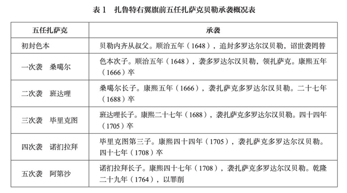 关于扎鲁特右翼旗前五任扎萨克承袭,《王公表传》记录如下。