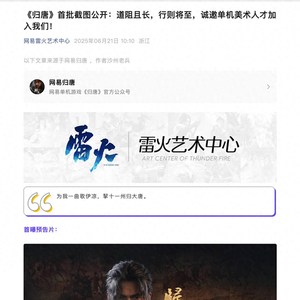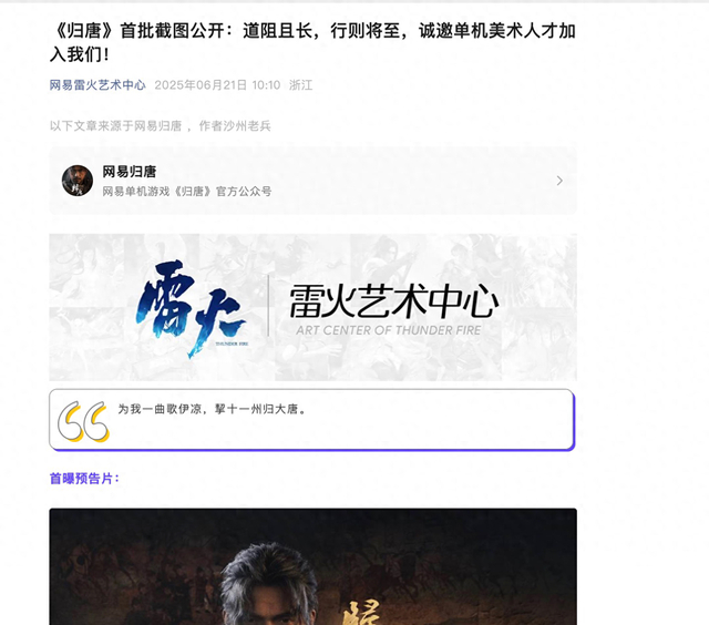 据了解,《归唐》为单机游戏,是网易游戏雷火事业群临安24工作室的首部作品,由雷火艺术中心提供了美术支持。它是一款关注“大历史里的小人物”的动作冒险单机游戏;它是一款在各个质量维度上严格对标欧美一线大厂作品的沉浸式线性叙事游戏;这也是雷火在游戏行业深耕二十年后,对单机游戏领域发起的转型冲锋。