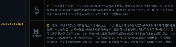 其中温氏股份2024年12月14日发布了拟收购筠诚和瑞91.38%股权的公告。12月16日就有投资者在互动平台提问相关问题,温氏股份在回复中较为细致地阐述了本次收购的战略意义:筠诚和瑞为公司产业链上下游相关企业。(1)畜禽养殖场粪污处理和资源化利用具有可观的挖掘空间。本次收购后,公司养殖业与筠诚和瑞的环保技术、服务可以紧密协同,有助于公司降低养殖成本,还可以提供更高的经济附加值。(2)筠诚和瑞在生物质能源领域拥有前沿的技术储备和丰富的项目经验。本次收购后,筠诚和瑞可以进一步加速和深化在该领域的布局,利用公司独特的畜禽粪污资源优势,开发利用生物质能源,为企业创造新的经济增长点,同时推动农牧业向绿色低碳、可持续发展的方向稳步迈进。