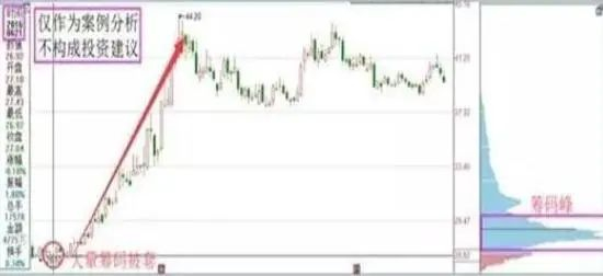 看图要点: 经较长时间整理形成低位单峰密集,此后股价跌穿单峰密集。回调时原密集峰没有减少的迹象,成交缩量。洗盘回调幅度不太大,通常小于20%。