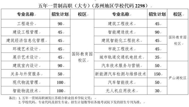 五年制高职开设了建筑工程技术、建筑智能化工程技术、市政工程技术、智能建造技术、工程造价、建设工程管理、建筑经济信息化管理、建筑室内设计、环境艺术设计、展示艺术设计、新能源汽车检测与维修技术、汽车智能技术、汽车技术服务与营销、无人机应用技术、城市轨道交通机电技术、关务与外贸服务、现代物流管理、智能物流技术等18个专业,毕业颁发江苏联合职业技术学院全日制文凭。
