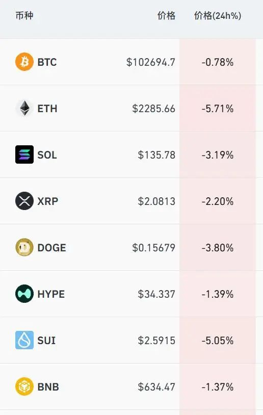 加密货币市场集体下跌。截至发稿,比特币跌破103000美元,以太坊大跌超5%,狗狗币也跌近4%。