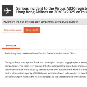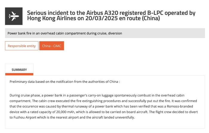 3月20日,由杭州飞往香港的航班上,飞机头顶客舱内发生起火事件,随后飞机迫降。根据法国航空事故调查局初步调查,该事故是由充电宝的热失控引起的,该充电宝已被证实为罗马仕品牌的设备,额定容量也是2万毫安时。