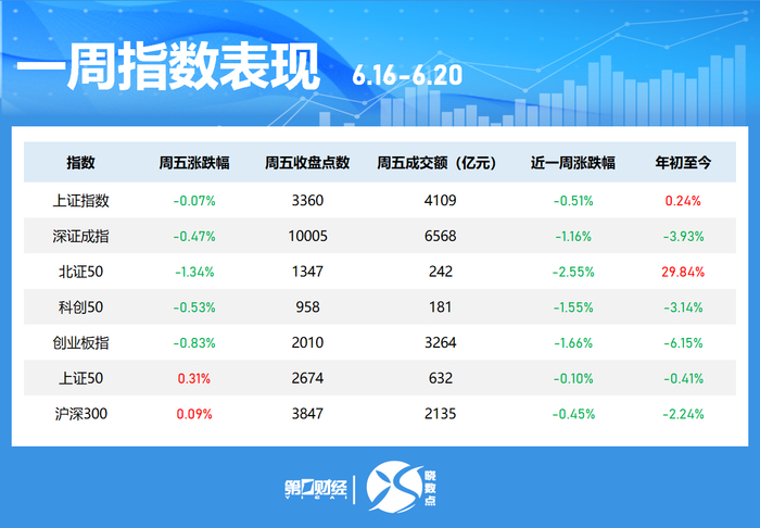本周(6月16日至6月20日)的五个交易日中,A股三大指数集体下跌,沪指累计跌0.51%,深成指跌1.16%,创业板指跌1.66%。