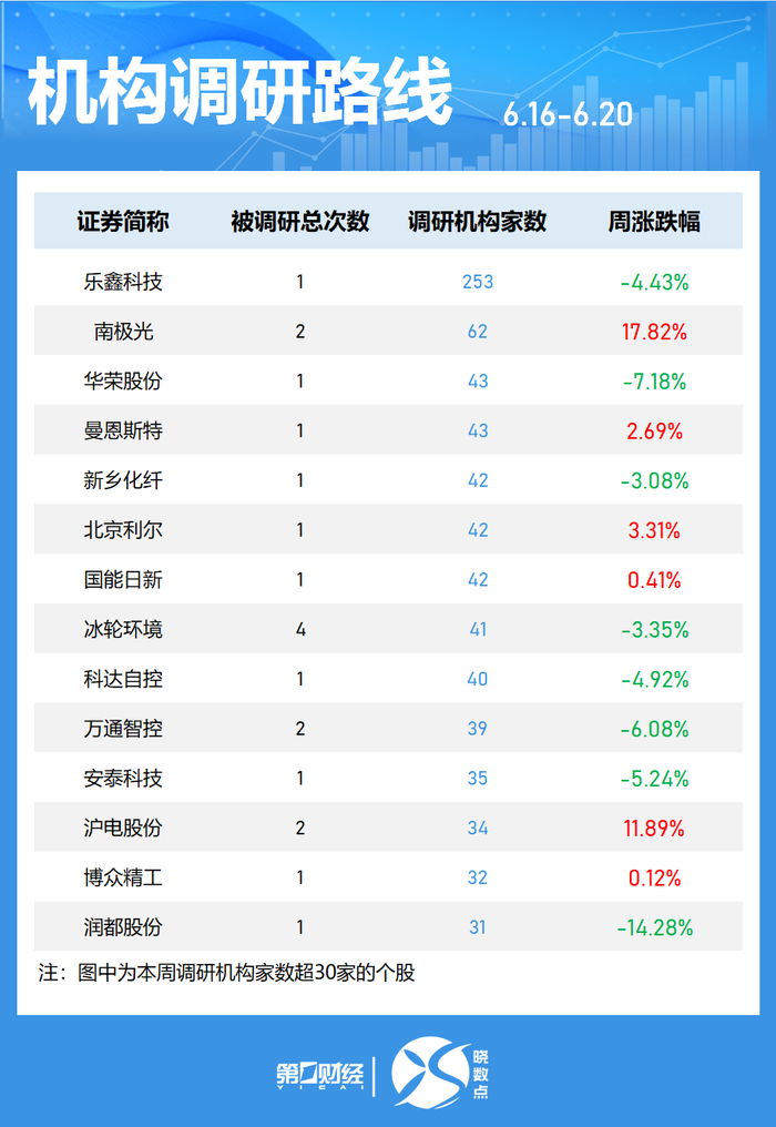 Wind数据显示,机构本周(6月16日至6月20日)共调研了208家上市公司,其中乐鑫科技最获关注,参与调研的机构达253家,南极光获得62家机构调研。