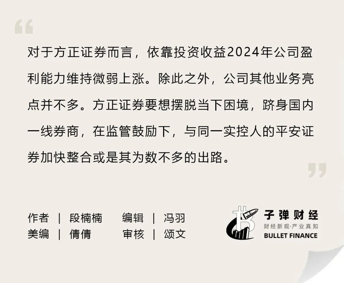 对于方正证券而言,依靠投资收益2024年公司盈利能力维持微弱上涨。除此之外,公司其他业务亮点并不多。方正证券要想摆脱当下困境,跻身国内一线券商,在监管鼓励下,与同一实控人的平安证券加快整合或是其为数不多的出路。