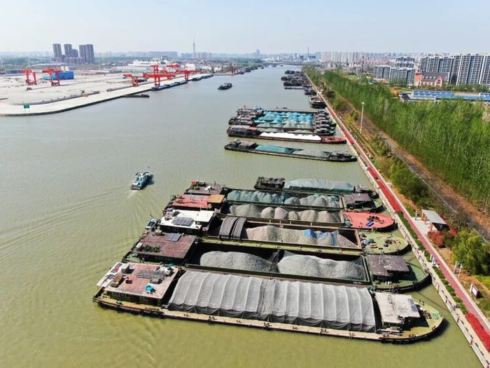 朝阳升起,汽笛轰鸣,金色的阳光洒满京杭运河,河面上船舶来往不断,运载了南来北往、源源不断的人员和物资。不远处的江苏黄码港数智科技有限公司里,大屏幕上实时显示着汽运、水运业务的交易分析以及平台货源结构、累计货运量等最新数据。