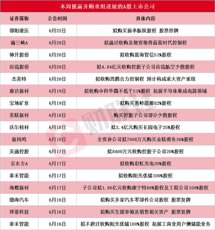 据财联社不完全统计,截至发稿,本周披露并购重组进展的A股上市公司共有17家,包括邵阳液压、渝三峡A、神开股份、应流股份、杰美特、康达新材、宝地矿业、美联新材、沃尔核材、新凤鸣、吴通控股、京东方A、泰禾智能、海螺新材、渤海汽车、邦基科技和泰禾智能,具体情况如下图: