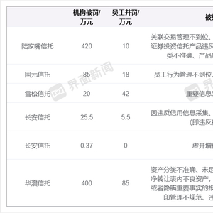 界面新闻记者关注到,今年以来,5家被罚信托公司相关负责人及具体到一线的业务人员无一例外均吃到监管罚单,监管“双罚制”(即机构和责任人同时处罚)在被进一步贯彻的同时,监管惩罚从 “事后处罚” 到 “全流程问责”被更加体现得淋漓尽致。