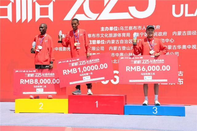 6月22日,获得2025乌兰察布马拉松(42.195公里)男子组前三名的选手合影留念。