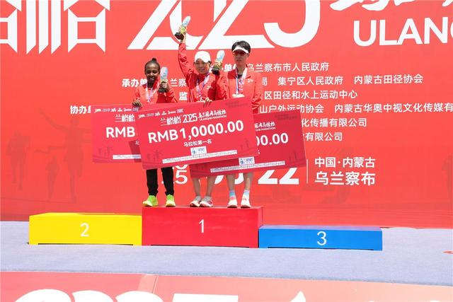 6月22日,获得2025乌兰察布马拉松(42.195公里)女子组前三名的选手合影留念。
