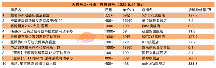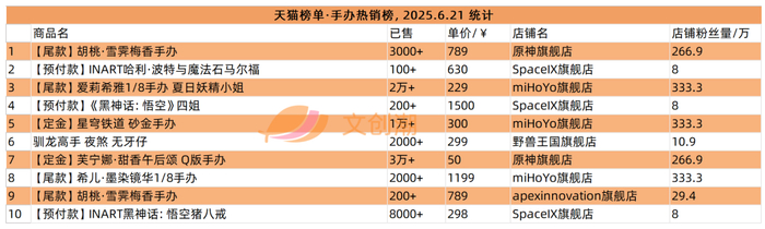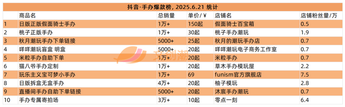 实时更新的抖音手办爆款榜,6月21日文创潮统计时的前五如图所示。