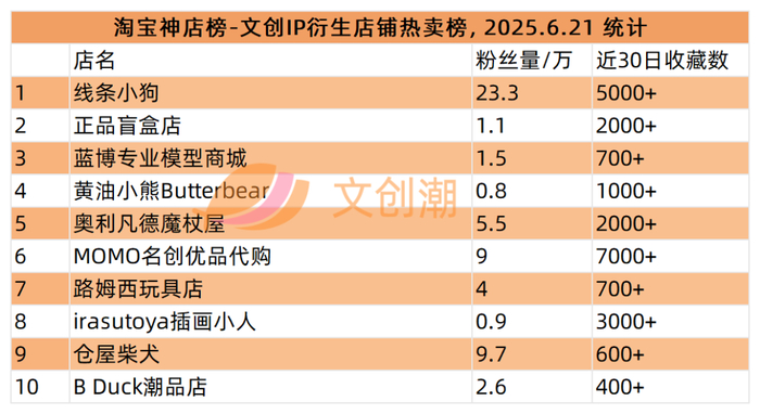 本周统计到的文创IP衍生店铺热卖榜,前五分别是:
