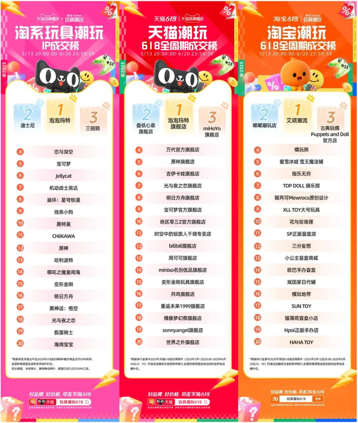 本周是618大促收官。今年天猫潮玩618全周期成交榜,前二十分别为: