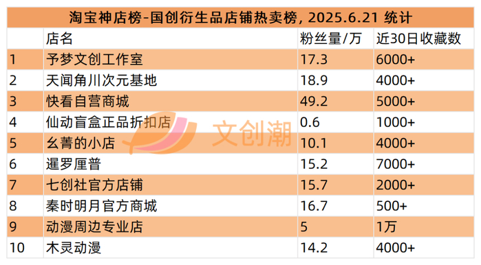 国创衍生品店铺热卖榜,前五名分别是:
