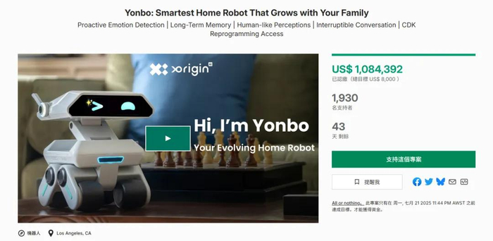 投资AI玩具/AI潮玩的还有奥飞娱乐,本月初其参投的基金已募集完毕并完成备案,基金计划定向投资于深圳玄源科技有限公司股权,后者的产品包括Yonbo(元宝),宣称是世界首款具备长期记忆的AI伴侣机器人,具备情感检测、多模态交互和个性化学习等功能,拥有心理指导模型20+,目前在KickStarter众筹平台已经筹集超过100万美元的资金。