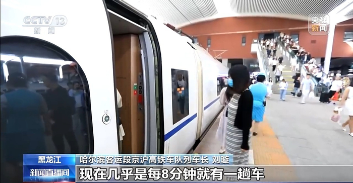 哈尔滨客运段京沪高铁车队列车长 刘璇:从最开始每天十几趟,现在最短间隔8分钟就有一趟车,哈尔滨客运段为旅客提供更优质、更好的出行体验。