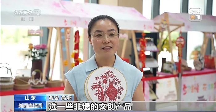 游客 高娜:经常跟朋友们来这里逛一逛,选一些非遗的文创产品,今天选了几把这个剪纸的折扇,特别喜欢。