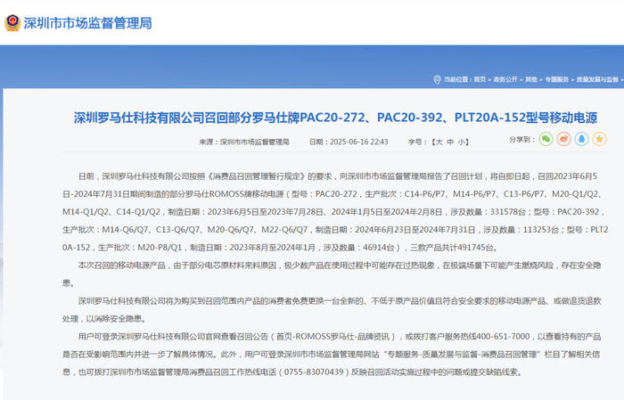 无独有偶,6月16日晚上,深圳市市场监督管理局发布消息称,深圳罗马仕科技有限公司召回部分罗马仕牌PAC20-272、PAC20-392、PLT20A-152型号移动电源,三款产品共计491745件。