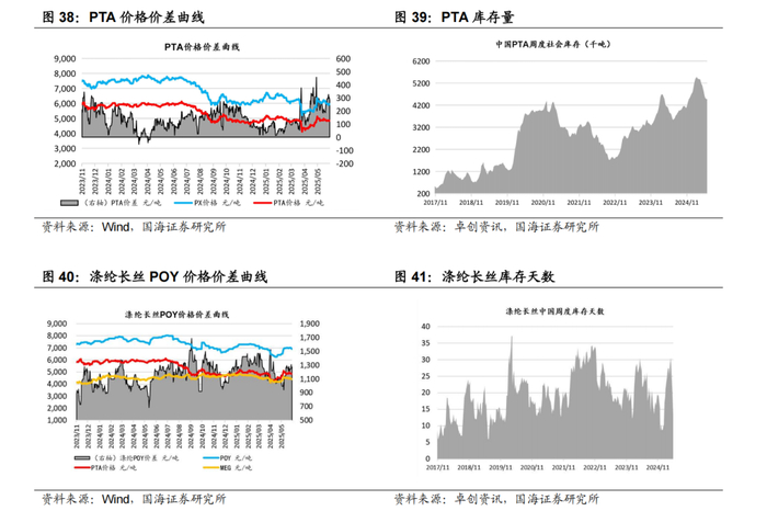 据Wind和卓创资讯,2025年6月19日涤纶长丝库存天数为17.2天,较6月12日下降3.3天。2025年6月20日PTA库存为444.7万吨,较6月13日下降3.5万吨。涤纶长丝POY价格为7200元/吨,较6月13日上涨300元/吨。PTA价格为5290元/吨,较6月13日上涨300元/吨。