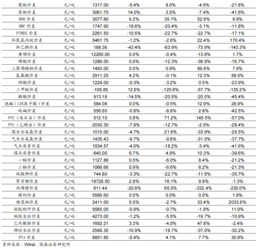 我们跟踪的171种产品的价格中,有72种上涨,占比42.11%,有23种产品下跌,占比13.45%。周涨幅前五的产品分别为:甲醇:华东(11.51%)、苯胺:华东(8.01%)、纯苯:FOB韩国(6.41%)、PX:FOB韩国(6.02%)、LDPE低密度聚乙烯:齐鲁石化(5.38%)。周跌幅前五的产品分别为:三氯甲烷(-6.25%)、丙烯酸甲酯(-5.88%)、纯MDI:华东(-2.86%)、聚碳酸酯PC(-1.89%)、醋酸乙烯:华东(-1.83%)。