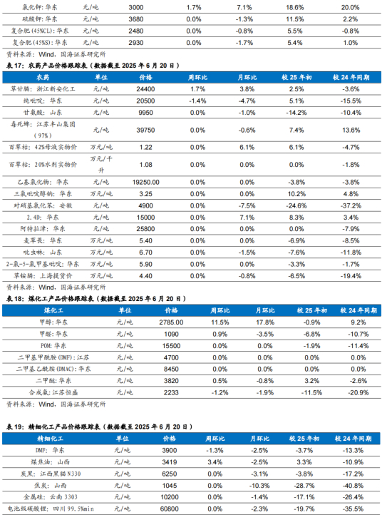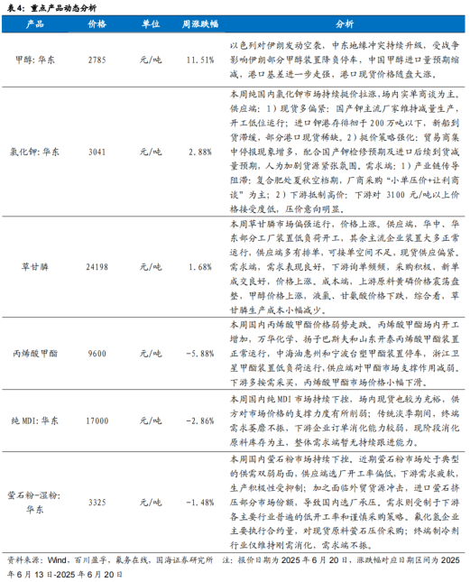 本周(2025年6月13日-2025年6月20日,下同)甲醇价格宽幅上行,环比+11.51%至2785元/吨。以色列对伊朗发动空袭,中东地缘冲突持续升级,受战争影响伊朗部分甲醇装置降负停车,中国甲醇进口量预期缩减,港口基差进一步走强,港口现货价格随盘大涨。本周国内氯化钾市场持续挺价拉涨,环比+2.88%至3041元/吨。供应端:1)现货多偏紧:国产钾主流厂家维持减量生产,开工低位运行;进口钾港存徘徊于200万吨以下,新船到货滞缓,部分港口现货稀缺。2)挺价策略强化:贸易商集中停报现象增多,配合国产钾检修预期及进口后续到货减量预期,人为加剧货源紧张氛围。需求端:1)产业链传导阻滞:复合肥处夏秋空档期,厂商采购“小单压价+让利商谈”为主;2)下游抵制高价:下游对 3100 元/吨以上价格接受度低,压价意向明显。本周草甘膦市场偏强运行,价格上涨,环比+1.68%至24198元/吨。供应端,华中、华东部分工厂装置低负荷开工,其余主流企业装置大多正常运行,供应端多有排单,可接单空间不足,现货供应偏紧。需求端,需求表现良好,下游询单频频,采购积极,新单成交良好,价格上涨。成本端,上游原料黄磷价格震荡盘整,甲醇价格上涨,液氯、甘氨酸价格下跌,综合看,草甘膦生产成本小幅减少。