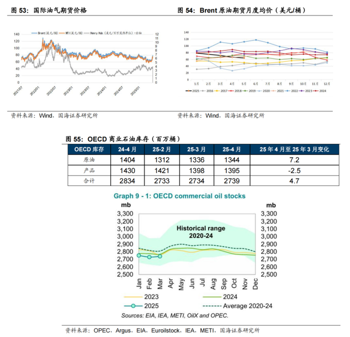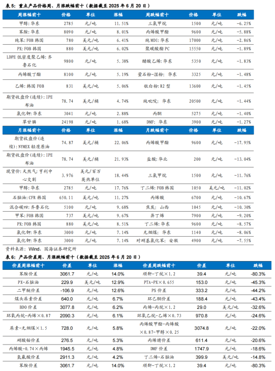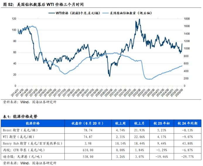 据Wind,截至2025年6月20日,Brent和WTI期货价格分别收于78.74和74.87美元/桶,周环比4.74%和2.31%。