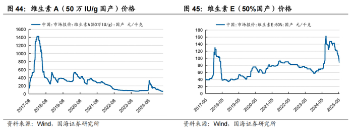 据Wind,2025年6月20日,维生素A价格为63.5元/千克,环比6月13日下降3.5元/千克;维生素E价格为75.50元/千克,环比6月13日下降12.5元/吨。