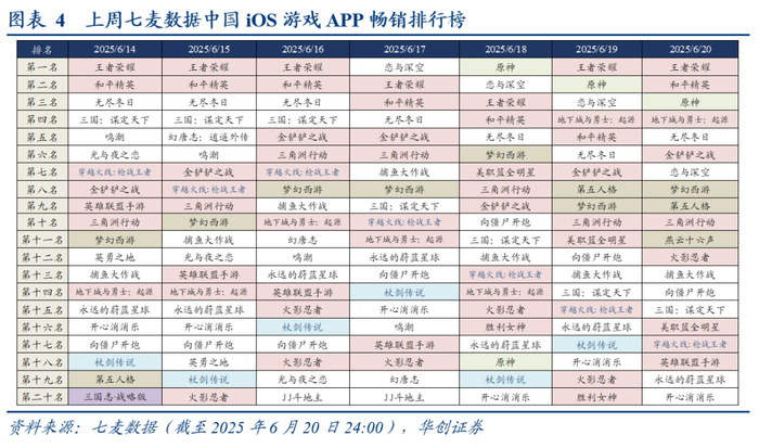 根据图表数据,2025年6月14日至2025年6月20日游戏iOS畅销排行显示,腾讯系产品持续占据主导地位,《王者荣耀》、《和平精英》稳居前五(大多数时间均居榜首),《金铲铲之战》、《穿越火线-枪战王者》、《三角洲行动》长期位居中上游,《地下城与勇士:起源》《火影忍者》高频上榜,《胜利女神》快速提升,跻身榜单前十。网易系产品紧随其后,《梦幻西游》稳居前列,《蛋仔派对》、《第五人格》与新游《燕云十六声》在榜单中尾部探索突破。受益于5.7版本在6月18日上线,米哈游旗下《原神》排名快速跻身第一。其他厂商方面,《无尽冬日》、《三国:谋定天下》稳定靠前、《恋与深空》版本更新后排名快速提升,《永远的蔚蓝星球》、《向僵尸开炮》、《杖剑传说》等表现亮眼。