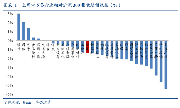 上周传媒(申万)指数整体下跌1.81%,同期沪深300指数整体下跌0.45%,板块跑输沪深300指数1.36%,位列所有板块第15位。我们认为当下传媒板块明线为AI应用起势,暗线为哪吒带来的文化自信,需要锐度和配置并重;2023年是闭源通用大模型的爆发之年,看好今年成为中国开源大模型的爆发及应用格局重塑之年。第一步为公有云价值重塑+产业重回增长(阿里云+腾讯云,以及产业链相关公司)。第二步为有平台有用户有场景,但缺少大模型能力赋能或此前没有下定决心的公司(如B端SAAS企业+互联网平台企业)。第三步为C端场景不断落地(如端侧硬件+游戏娱乐)。建议关注游戏板块如华通、恺英、巨人、电魂、完美、吉比特、盛天、富春等。
