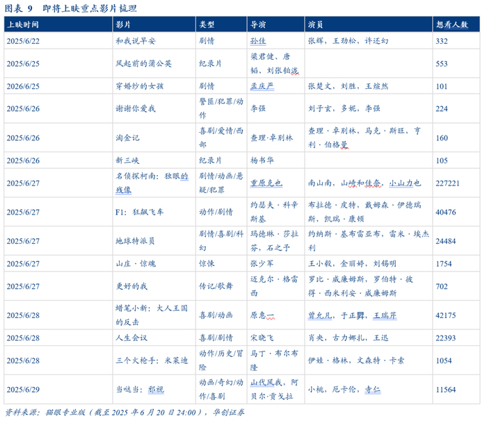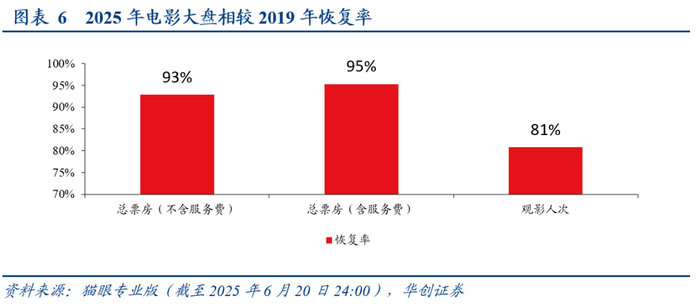 根据猫眼专业版,截至6月20日,2025年电影大盘实现票房(不含服务费)256.10亿元,观影总人次6.18亿人;2019年同期电影票房为275.95亿,观影总人次为7.65亿人。复苏节奏看,票房大盘已恢复约93%,观影人次已恢复约81%。
