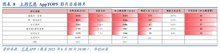 根据艺恩APP票房排名,2025.6.16-2025.6.20(周一到周五)院线上映电影TOP5分别为《酱园弄·悬案》、《新·驯龙高手》、《分手清单》、《碟中谍8:最终清算》、《时间之子》,五部影片票房(不含服务费)分别4350万/4015万/2265万/1794万/1219万,当周票房比例分别26.1%/24.1%/13.6%/10.8%/7.3%。