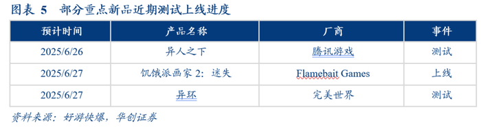 新游方面,Flamebait Games制作的Steam移植游戏《饥饿派画家2:迷失》将于6月27日正式上线,腾讯旗下的《异人之下》将于6月26日开启测试。完美世界旗下幻塔工作室新作《异环》将于6月27日开启移动端+PC双端测试。