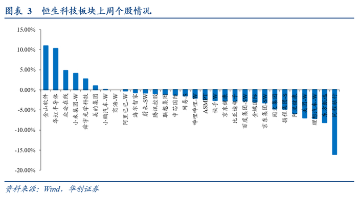 本周港股互联网科技板块涨跌幅:金山软件(10.94%)/华虹半导体(10.27%)/众安在线(4.81%)/小米集团-W(4.04%)/舜宇光学科技(2.68%)领涨。同程旅行(-16.08%)/东方甄选(-8.11%)/理想汽车-W(-7.1%)/美团-W(-6.95%)/阿里健康(-5.87%)领跌。