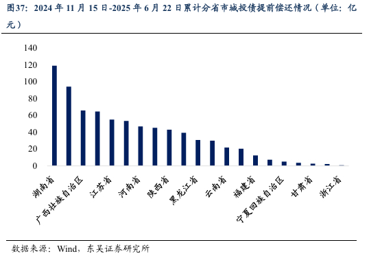自2024年11月15日至本周,全国城投债提前兑付规模共计761.93亿元,兑付规模最高的省市为湖南省,累计兑付规模118.96亿元,其次重庆市和广西壮族自治区,分别兑付94.12亿元和65.87亿元。
