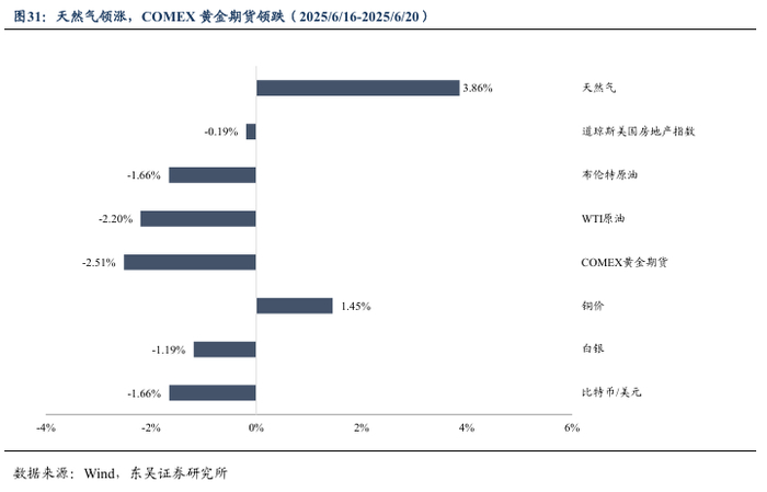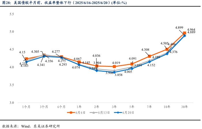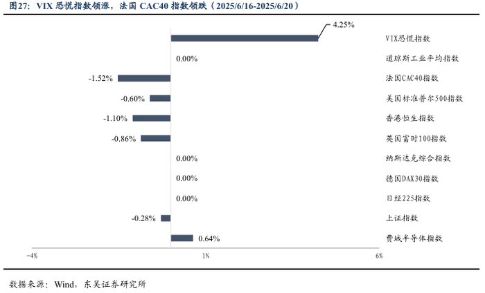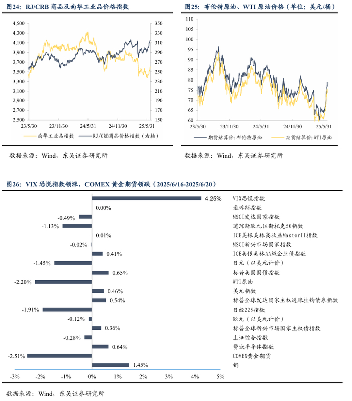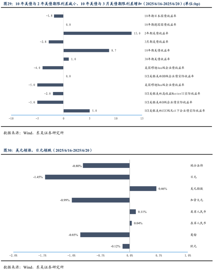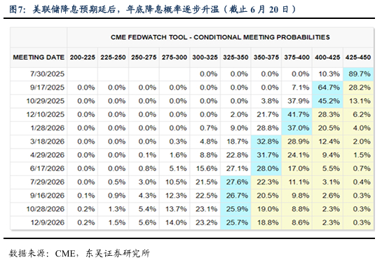 (3)美联储货币政策会议决定维持利率不变,降息时点需关注通胀轨迹。美国当地时间18日,美国联邦储备委员会宣布将联邦基金利率目标区间维持在4.25%至4.50%之间不变。美联储决策机构联邦公开市场委员会当天在声明中表示,当前美国经济前景仍存在较大不确定性,将继续监控风险因素。美联储主席鲍威尔当天在新闻发布会上表示,美政府关税政策对消费者的影响已开始显现,预计今后数月将更加明显。他表示,当前在售的部分商品是在关税增加前进口的,需要缴纳更多关税的进口产品将逐渐增加。他认为,现在全面评估关税对经济的影响还为时过早。截至6月20日,Fedwatch预期2025年7月降息25bp的概率降至10.3%,9月降息概率升至71.8%。10月份在7月份已经降息25bp的前提下再下降25bp的概率达41.7%。总的来看,当前市场近期降息预期持续降温,而下半年有望成为美联储货币政策调整的关键时点。