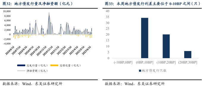 本周(2025年6月16日-2025年6月22日,下同)一级市场地方债共发行60只,发行金额2,617.53亿元,其中再融资债券1,920.31亿元,新增专项424.77亿元,新增一般债272.45亿元,偿还量1,374.18亿元,净融资额1,243.34亿元。主要投向为综合。
