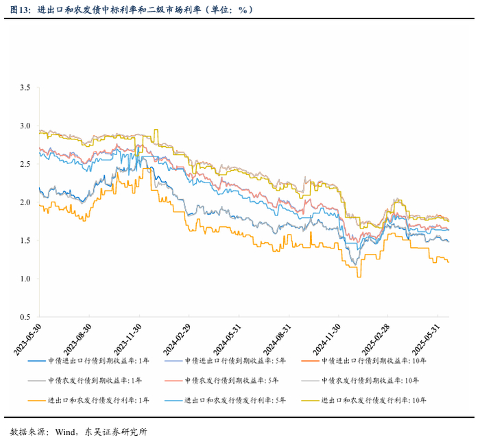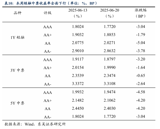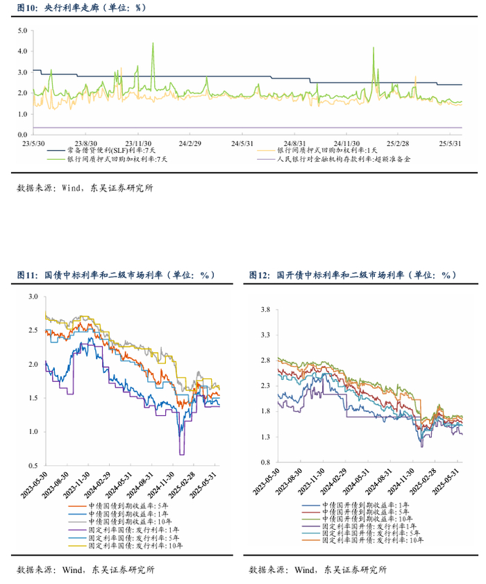 第二,6月买断式逆回购二次操作彰显央行对资金支持态度,今年宏观政策发力较去年前置,流动性“主动式”宽松。5月基本面数据公布,延续总量韧性但结构分化,需求方面受外部关税缓和和内部补贴政策共振,投资方面房地产的负向拖累仍然较大。政策方面已经先行应对,央行6月进行两次买断式逆回购操作,合计净投放2000亿元,由于政策向实体经济传导是慢变量,我们认为央行将持续为流动性保驾护航,10年期国债收益率将下降至1.5%的水平