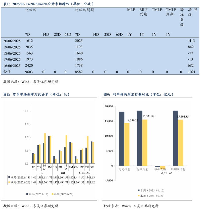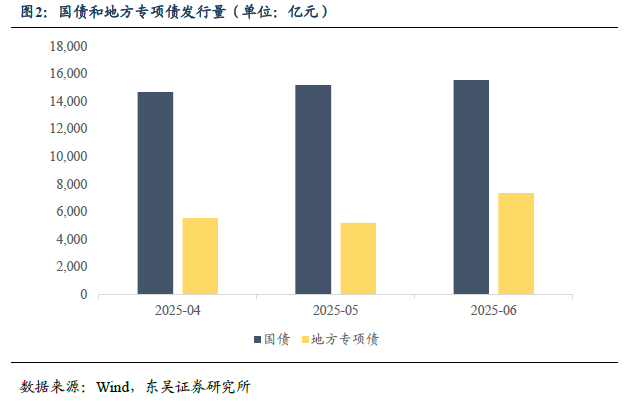 周度思考:短期内利率仍然在窄幅震荡,但我们认为得益于流动性宽松,利率下行的逻辑在即将到来的1个月中较为顺畅。第一,债券发行高峰将结束,流动性“被动式”宽松,7月资金面无虞。回顾二季度,国债和地方专项债接续支持财政发力。截至6月20日,国债4-6月的发行量分别为1.47万亿元、1.52万亿元和1.56万亿元,地方专项债4-6月的发行量分别为2300亿元、4400亿元和3800亿元,5-6月均出现放量情况。根据我们在《财政发行先行下的国债供给测算》中的预测,在一般国债和特别国债的共同推动下,下一轮的国债供给高峰将出现在8-9月。同时,“自审自批”省份倾向于将大部分专项债额度放至6月前,以留下更多余地进行资金的落地使用。