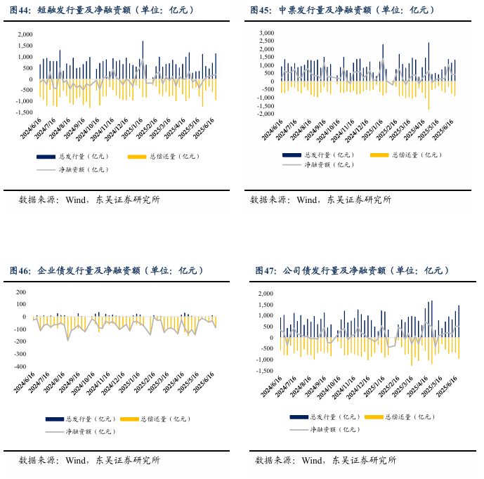 按照债券类型细分,短融净融资额208.06亿元,中票净融资额434.02亿元,企业债净融资额-87.83亿元,公司债净融资额518.51亿元,定向工具净融资额-18.73亿元。