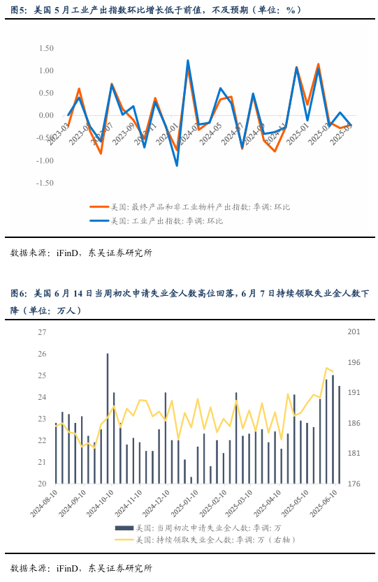 (2)美国6月14日当周初次申请失业金人数高位回落,6月7日持续领取失业金人数下降;5月工业产出指数环比下降,消费者需求降温。截至6月14日当周,美国初请失业金人数录得24.5万人,较前一周的25万人小幅回落,符合市场预期。同期,续请失业金人数降至194.5万人,环比减少6000人,但高于市场预期的194.1万人,显示劳动力市场在高位运行下略有放缓。整体来看,尽管失业相关指标出现边际改善,但续请人数高于预期反映就业市场仍存一定压力。美国5月工业产出环比下降0.2%,低于前值和市场预期,表明制造业活动动能减弱。最终产品及非工业物料产出指数亦环比下滑0.2%,且已连续三个月下降,进一步印证工业领域需求疲软。