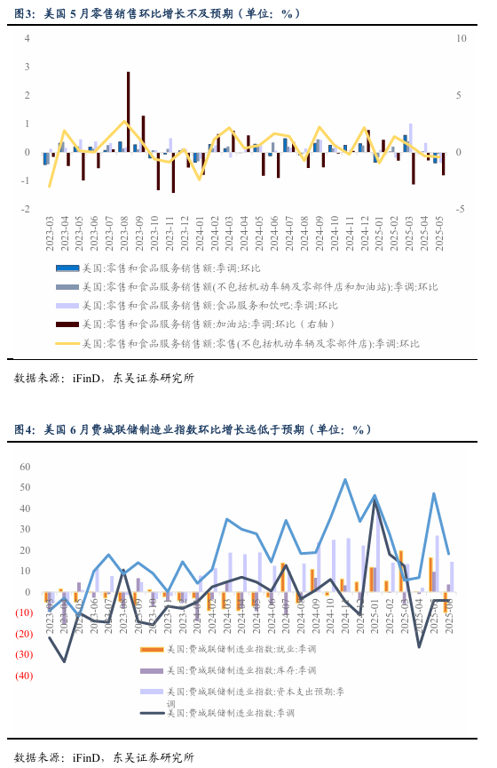 (1)美国5月零售销售环比增长不及预期,陷入较深的萎缩区间;6月费城联储制造业指数环比增长远低于预期,反映企业用工需求显著减弱。美国5月零售销售月率由前值0.1%大幅降至-0.9%,跌幅远超市场预期的-0.6%,为2023年3月以来最大单月降幅,显示整体消费动能显著减弱。其中,汽车类销售环比下滑3.5%;剔除汽车后,5月核心零售销售降幅为0.3%。分项来看,加油站、商超及餐饮业销售额分别环比下降2.0%、0.7%和0.9%。整体来看,关税前景不确定性与高企物价共同抑制了消费者支出。费城联储6月制造业指数环比录得-4.0,持平于前值,低于市场预期的-1.5,持续位于收缩区间。分项数据显示,就业指数降至-9.8,创2020年5月以来新低,反映制造业用工需求大幅收缩。新订单指数回落至2.3,显示市场需求依然疲弱。