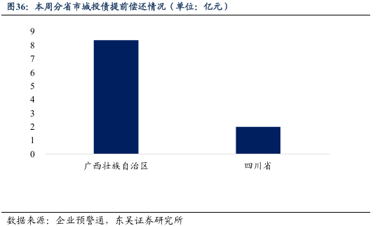 本周城投债提前兑付总规模为8.38亿元,按照兑付规模排名依次是广西和四川,分别提前兑付8.38亿元和2.00亿元。